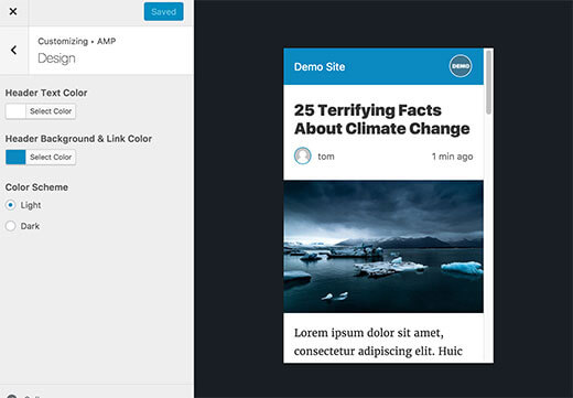To see the panel head over to Appearance > AMP where you can customize the design of your AMP-compliant pages. Click on “AMP” and then click on “Design” to see options for changing Header Text Color and Header Background & Link Color. You can also switch between light and dark color scheme.