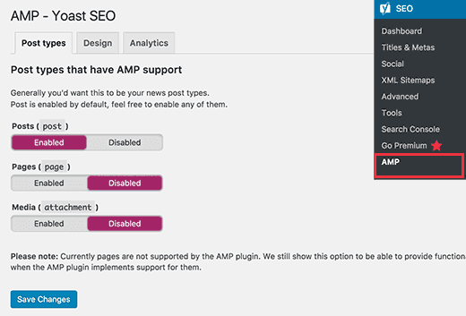 Step #2: Head over to SEO > AMP to configure the plugin. Here, you can see that the plugin allows you to enable AMP support for other post types pages and media attachments. However, they are disabled by default. Enable them if you want to add AMP support to your pages/media attachments. Or, leave them as is.