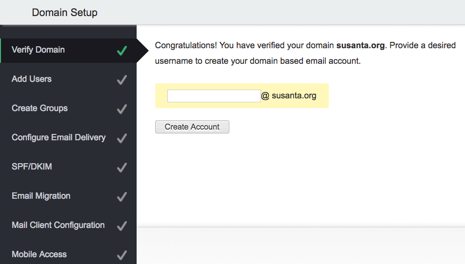 Step #12: Once you’ve verified your domain, you’ll see a congratulatory message. Now, you can create a username for your domain-based email address.